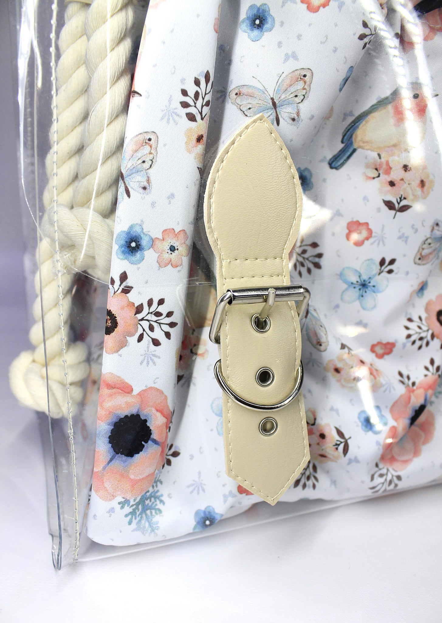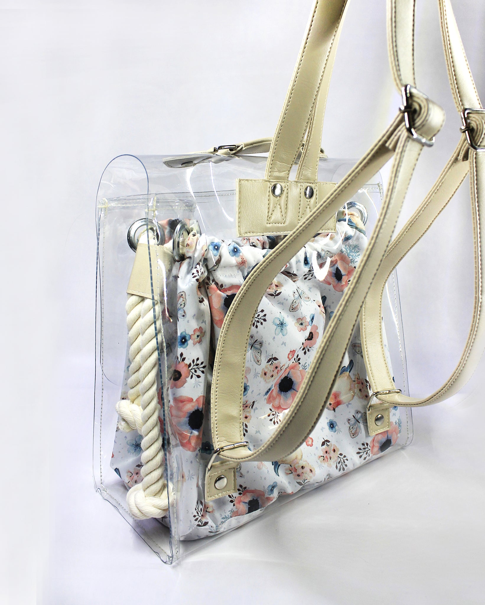 MATERIALES: Hecha de mica transparente, vinil y tela estampada. CRUELTY FREE. Las tonalidades de color pueden variar en las fotografías debido a la iluminación.